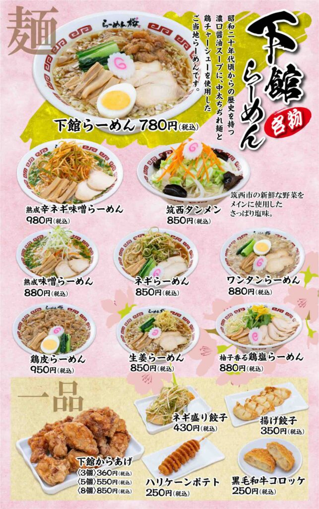 • 看板メニュー:下館らーめん(780円)、鶏皮らーめん(950円)