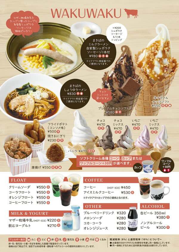 そして忘れてはいけないのが「ソフトクリーム」。濃厚なのに後味さっぱりという、牧場ソフトクリームの理想形です。バニラ(470円)のほか、キャラメルナッツソフト(550円)、プレミアムチョコソフト(580円)など、トッピング付きや期間限定フレーバーも。ミルクラーメンの後のデザートに最適ですね。