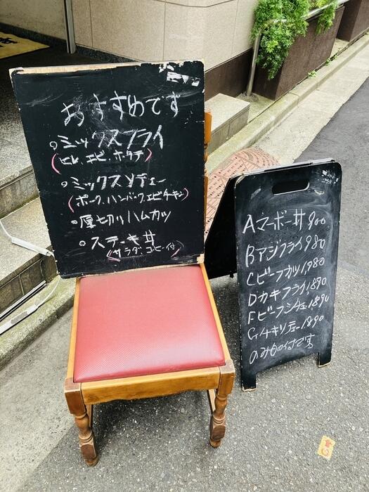 東京・日暮里駅南口から徒歩2分。「おっくす」と平仮名で書かれたレトロな看板が目印の、創業50年以上の老舗洋食店です。