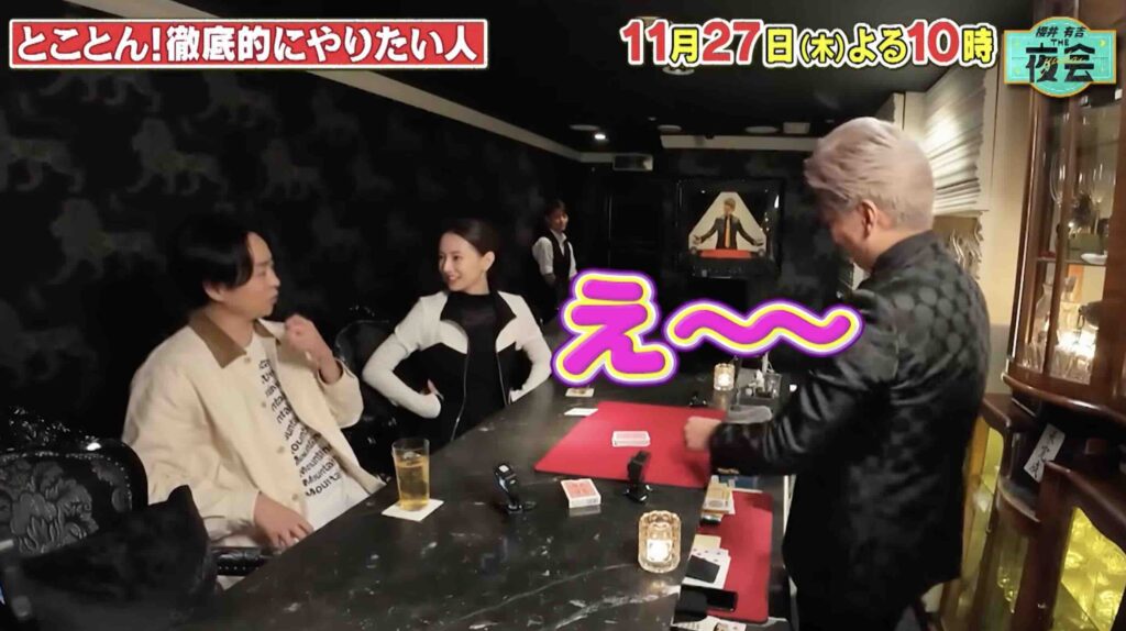 シックな空間で、テーブルマジックを目の前で披露してもらえるスタイルで、いわゆる「ショー付きバー」ではなく、席で自然にマジックが始まるタイプです。