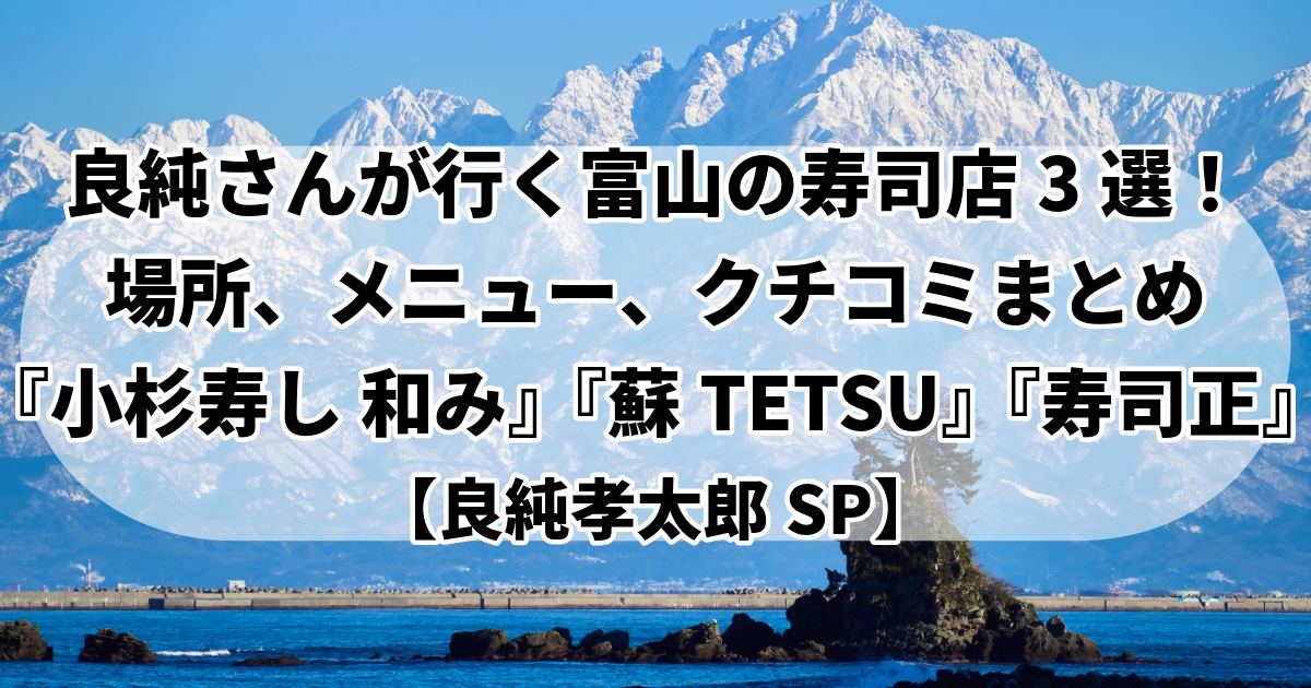 そこで今回、富山で良純さんお気に入りと噂される寿司店から、滑川の『小杉寿し 和み』、富山市内の『蘇TETSU』『寿司正』の3軒をピックアップ。評判や名物メニュー、アクセスまで、テレビの前で「行きたい!」ってなった方のために情報をまとめましたので、どうぞ。